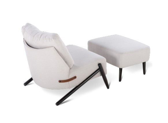 Puff Leca com estrutura em madeira, assento com percintas elásticas e pés em madeira.